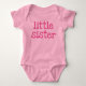 Pink text little sister T-shirts, long sleeve tees, bodysuits, organic bodysuits, tutu bodysuits, sleeveless dresses, ruffle shirts and dresses, hats, pullover hoodies, sweatshirts, raglan sleeve T-shirts, and other apparel for kids, babies, and toddlers who are a little sister! You can easily personalise these little sister T-shirts, bodysuits, and other apparel by adding a name below the pink text.