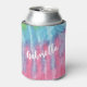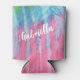 Trendy colors of pink and turquoise blue tie-dye pattern custom-printed can cooler with elegant script font name.