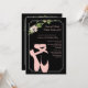 A beautiful invitation that's sure to get applause from your ballerina and guests alike. The ebony background is embellished with a corner spray of pink flowers and within it's pencil frame is a pair of pink toe shoes. The card is easy to customise with your wording, font, font colour and choice of six paper types.