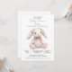 A pink toile bunny rabbit baby girl baby shower invitation featuring a sweet floral patterned stuffed bunny illustration and soft dusty rose typography. The gentle toile pattern gives the bunny a delicate nursery inspired look while the clean white background keeps the design elegant and modern. Centered artwork creates a charming focal point that feels warm, soft, and welcoming for a baby girl celebration. Perfect for a bunny themed baby shower, rabbit themed baby shower, or classic nursery inspired gathering. The simple layout keeps the event details easy to read while allowing the illustrated bunny to remain the heart of the design. Available in print, as a digital download or both.