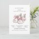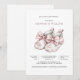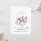 A pink toile girl baby shower design featuring delicate baby booties tied with a soft bow and patterned in classic toile. The pink baby shoes celebrate the arrival of a sweet baby girl and create a charming focal illustration for a girl baby shower. A lovely choice for pink baby celebrations welcoming a new little girl. Available in print, as a digital download or both.