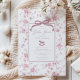 Elevate your baby shower celebration with our exquisite pink and white floral toile invitation, featuring a charming toile de jouy pattern. This elegant piece showcases a coquette bow and a delightful rocking horse. Perfectly crafted to set a sophisticated tone for your event, this invitation not only conveys your joyous occasion but also adds a touch of timeless elegance that your guests will adore. Make your baby shower unforgettable with this stunning invitation that reflects both style and grace.