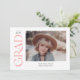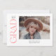 This stylish graduation announcement features the word grad in a pink trendy serif along the left side. The front has space for a photo of the grad as well as their name, class year, and school. The back of the announcement has space for a second photo and a short message.