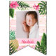 Bunting flags with your customised photos & designed in tropical style with tropical leaves, gold pineapple, pink floral and pink background.