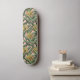 This cool tropical banana skate deck features hand drawn illustration of yellow banana bunches and tropical green banana leaves against a pink background with subtle raindrop detailing in a lighter pink.