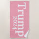 This Donald Trump 2024 presidential campaign beach towel features a pretty, girly design. The name Trump is printed in a large white font followed by the 2024 election year. The background is a beautiful pink to match the inside pink portion.