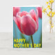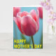 This card features a close-up photo of a single pink flower in the foreground, its petals opening gently like an affectionate embrace ❤️. Soft light glides across the petal edges, revealing fine lines and smooth curves that feel tender and intimate. Rich fuchsia tones fade into lighter blush shades, giving the bloom a romantic softness without needing any extra decoration. Behind it, a calm sky-blue background is softly blurred, with faint hints of other pink flowers that sit far back like quiet companions. The main flower is placed slightly off-center, drawing your eye into the layered folds and delicate contours. Along the bottom edge, the message “HAPPY MOTHER’S DAY” appears in bright yellow, set in clear uppercase letters that stand out against the cooler backdrop 🌼. The petals show subtle veining and gentle ripples, while the distant blossoms remain hazy and out of focus.