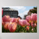 Bug's-eye view of pink tulips with a slight yellow base. The North End of Boston in the background.