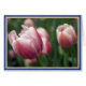 Photo of pink tulips with blue and ivory border. Blank.