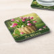 This coaster set with simply gorgeous pink tulips in a wicker basket can be personalised with your desired name.