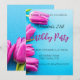 Pink tulips on a blue background. Composition for greeting card, wedding, mother, valentine, women, birthday, childbirth day. Spring flowers