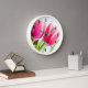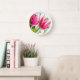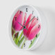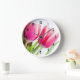 A clock with a beautiful spring photograph featuring 2 pink tulips and bright green leaves.