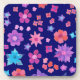 A set of cork-backed coasters, with a pattern of flowers in purple, turquoise, pink and orange on a Midnight Blue background, from a handpainted paper collage by Judy Adamson. You can easily change the background colour, if you wish, by using the Edit button.