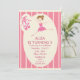 This customisable girls birthday party Invitation features a little ballerina wearing a pink tutu and pink ballet slippers. On a pink striped background and customisable text.