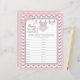 Word scramble game book page. Pink tutu grey polka-dot jumper, diaper, booties, and cute birdie on clothesline with 3D-look bow and grey and white chevron print background and pink accents.