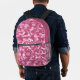 This backpack features a delightful camo style pattern in tones of burgundy, pink, and off white. Your triple letter monogram is in white within a matching burgundy circle banner at the centre of the pocket. The top of the bag is matching solid burgundy pink, making a nice contrast with the pattern.