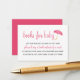 Slip these petite cards into your baby shower invitations when requesting books in lieu of cards. Designed to match our Pink Umbrella shower invitations for baby girls, cards feature a watercolor pink umbrella illustration with "books for baby" at the top and a sweet poem explaining the request: "just one request, we hope it's not hard // Please bring a book instead of a card // By signing your name, we'll remember and share // your sweet gift, even when you're not there." All text is customisable if you'd like to change the wording.