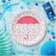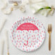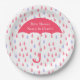 Custom baby shower paper plate, with graphics of a pink raindrop pattern and a big coral pink umbrella. Personalise the white text to read what you want. Matching invitations and other party supplies are available.