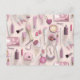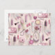 A pink-salmon arrangement of items that can be found on a vanity table; like brush, creams, camera, perfume, jewellery, brushes and so on.