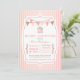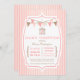 This 5x7 Baby Girl Shower invite has a pink and soft pink stripes background. In the foreground, there is a stylish white frame with a pink border. At the top, there are two bunting banners that are pink and brown draped from each side of the frame. Hanging from the middle is a brown bird cage with a pink bird silhouette sitting inside. Below, Baby Shower is written in a pink stylish font. The rest of the information is written in a vintage billing style that you can easily customise with your own information.