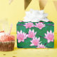 Wrapping paper in a pattern of water lillis in soft shades of pink, and emerald green lily pads, floating on a pond
