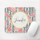 A mouse pad with a beautiful pattern featuring pretty pink flowers layered over top a striped pattern composed of blue and cream coloured stripes.