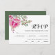 Pink watercolor bouquet of flowers script typography wedding RSVP card with meal choice. It showcases a beautiful bouquet of cactus flowers and succulent leaves in pink and your text. The word RSVP is in script typography. The back is of solid green colour.