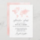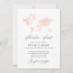 Pink watercolor world map wedding invitation card. With a beautiful blush pink hand painted watercolor world map and beautiful script text. Ideal for foreign location weddings or travel lovers.