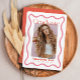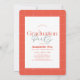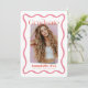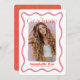 This trendy, retro, and modern graduation party invitation features your photo surrounded by a pink wavy frame. The reverse side features a red background with geometric patterns in pink. Personalise it for your needs. You can find matching products at my store.
