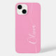 Pink Elegant White Calligraphy Script Custom Personalised Name iPhone 14 Smart Phone Cases features a modern and trendy simple and stylish design with your personalised name in elegant hand written calligraphy script typography on a pink background. Designed by ©Evco Studio www.zazzle.com/store/evcostudio