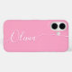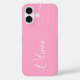 Pink Elegant White Calligraphy Script Custom Personalised Name iPhone 16 Smart Phone Cases features a modern and trendy simple and stylish design with your personalised name in elegant hand written calligraphy script typography on a pink background. Designed by ©Evco Studio www.zazzle.com/store/evcostudio