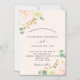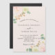 A light and airy golden background. Decorated with watercolored flowers, florals pink roses, white orchids and a yellow gerbera, eucalyptus greenery and faux gold sprigs. Personalise and add your names and wedding details. Black coloured letters.