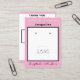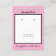 Upload Your Logo in white space, or delete sample placeholder to leave blank. Handmade Jewelry typography in white. Name in black against pink background. Crafted with Love written in black script (keep or insert short tagline, or delete to leave area blank). Two Small Circles against white and black framed background. NOTE: Circles are not pre-cut, you will need to use a small hole punch to make clean cut holes, to then place your Earrings in. Backside has small red heart. Insert telephone number, email address, website, social media handle. Insert Your Business QR Code for customers to Shop 24/7, or delete as needed. Original Design by TamiraZDesigns.