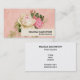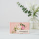 An elegant business card with a floral rose bouquet with white and pink flowers. Background is pink with a floral pattern. Pretty and elegant design.