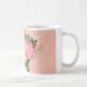 A mug with a floral rose bouquet with white and pink flowers. Background is pink with a floral pattern. Pretty and elegant design.
