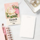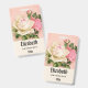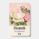Personalised name badge with a floral rose bouquet with white and pink flowers. Background is pink with a floral pattern. Pretty and elegant design.