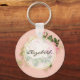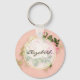 A key chain with a floral rose bouquet with white and pink flowers. Background is pink with a floral pattern. Pretty and elegant design. A white semi-transparent circle layered over top with a faux gold foil border. Personalise with a name.