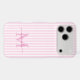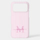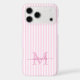 Protect your phone in style with this elegant personalized phone case, designed for a chic and feminine look. Featuring a soft pink and white striped background, the back of the case showcases your monogram initial and name in a fancy script font, creating a timeless and sophisticated design.
