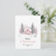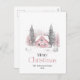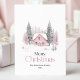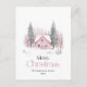 This charming Christmas card features a soft watercolor illustration of a pink cottage nestled among snowy evergreens and bare winter trees. The elegant "Merry Christmas" greeting is printed in a delicate serif font, adding a cosy and festive touch. Customisable with a family name and date, this whimsical card is perfect for spreading warmth and joy through seasonal greetings and holiday mailings.
