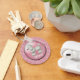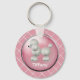 Cute poodle key chain done in a pink, with a white criss cross pattern. Graphics of a large pink button, in the middle, has an adorable fluffy white poodle, and white custom text. Personalise the text to read what ever you want. Makes a great gift idea.