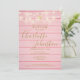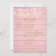 A rustic baptism or christening invitation featuring pretty string lights, an elegant gold cross and script signature name on a pink wood panels background. Personalise with your special baptism or christening information in gold chic typography. Designed by Thisisnotme©
