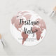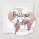 Round table name cards with a world map and your own favourite travel destinations as table names. The elegant pink / rose gold globe table numbers are really fun for a destination wedding or travel theme reception, baby shower, bridal shower or mitzvah.