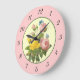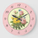 A wall clock with pink and yellow roses from vintage botanical artwork with blue butterflies on a faux parchment background and antique numbers in black on an pink background.