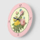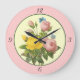 A wall clock with an antique reproduction of pink and yellow roses from vintage botanical artwork by famous artist Pierre Redoute with blue butterflies on a faux parchment background and antique numbers in black on a pink background. Click Customise It to add your name or message, change background colours and more.
