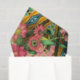Pretty pink daisies, bright yellow freesias, and dark green palm leaves decorate a wide diagonal band of black and white zebra print and a yellow and turquoise Indian print. The result is a tropical floral collage that will add a dramatic pop of colour.