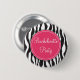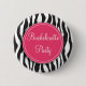 This adorable bachelorette party button feature a black & white zebra print background. On top is a decorative pink shape with a white border. The words "Bachelorette Party" are displayed on top of the button in a styled font. Customise the words with your details.