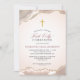 This elegant first communion invitation features gorgeous pink agate and faux gold glitter. This pink invitation is accented with a small gold cross and elegant rose gold script text and is perfect for a girl's first holy communion.