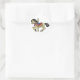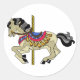 This design features a vintage pinto spotted carousel horse with ornate saddle and trappings on a golden pole.