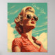 Step back in time with this stunning art poster, a homage to the golden era of Hollywood glamour. The piece features a striking portrait of a woman exuding classic 1950s elegance. Her hair is styled in a chic, sculpted wave, reminiscent of the iconic starlets of the mid-century. Oversized, round sunglasses give her an air of mystery and sophistication, while her bold red lipstick provides a pop of vibrant colour that stands out against the serene sky blue background.