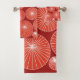This towel set has a mid-century modern design of red circles with white starbursts in them, all on a field of brick.